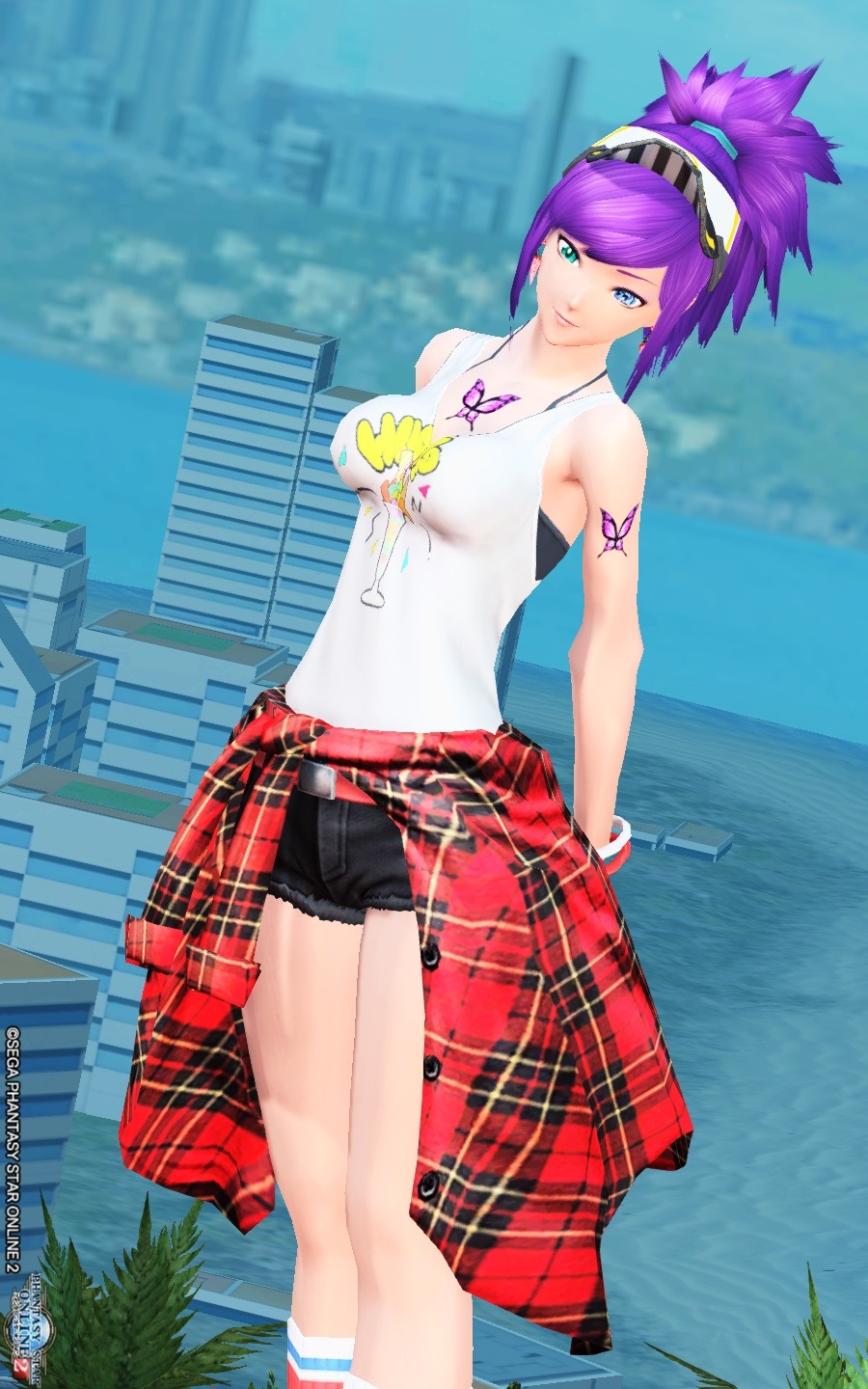 チェックシャツは位置を少々下げ、お腹部分の肌を隠すようにしました。