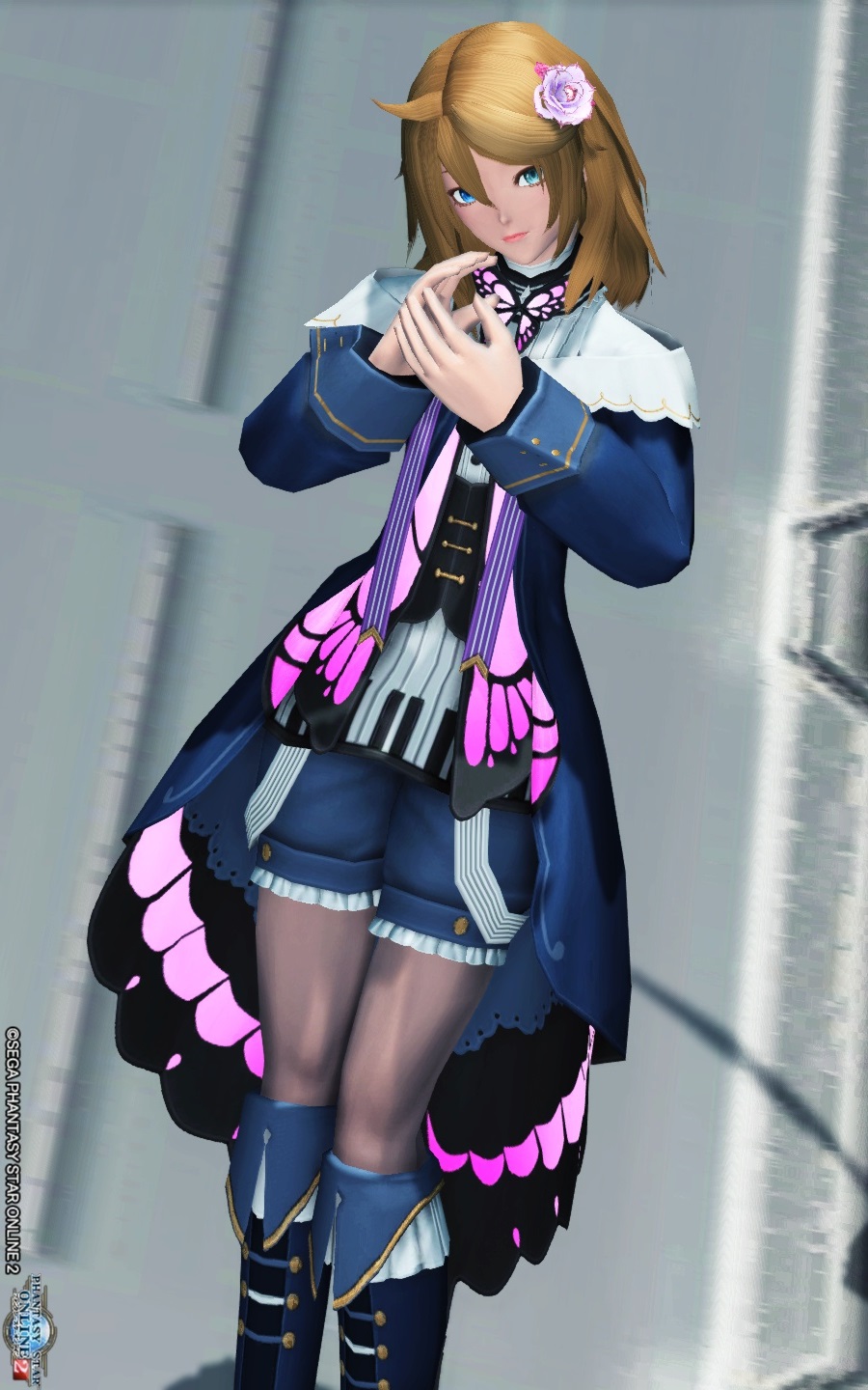 初版の青系の蝶から紫(桃?)系の蝶になった事で、より男の娘衣装になったのかな?